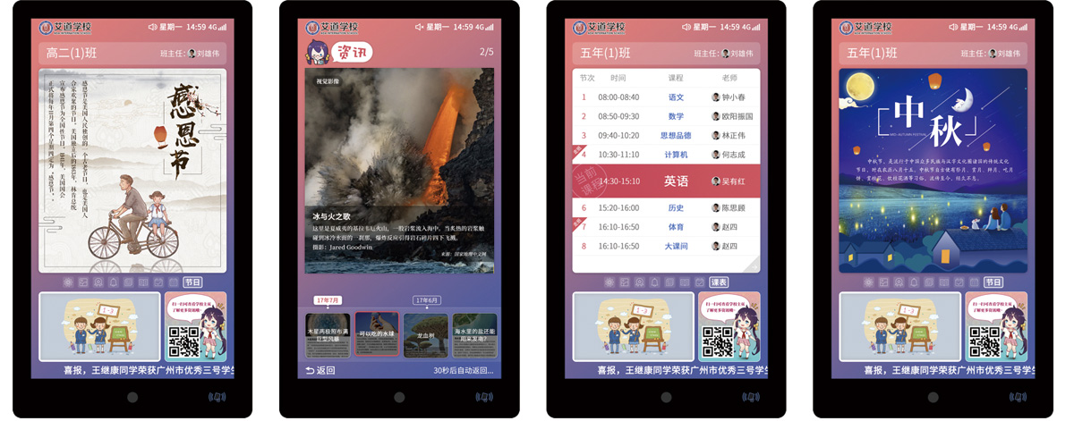 慧能智慧班牌服務于普教全學段來自于全國各個地區的學校,也為不同學段不同地區的學校個性化需求,甚至同一地區同一學段的不同學校的個性化需求提供了完美的解決方案,做到了硬件配置的高適應性與軟件選擇的高個性化。