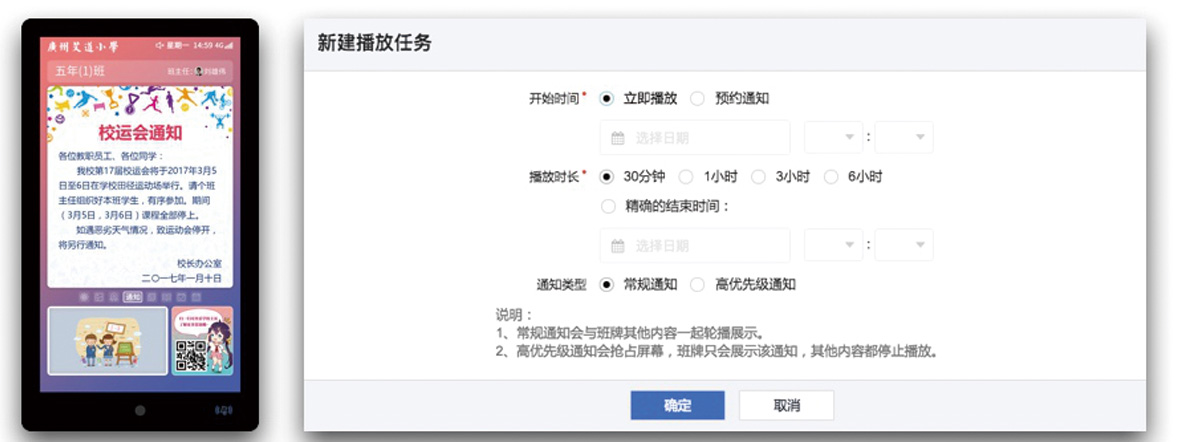 學校與老師可以通過班牌發布不同形式的通知,為了簡化操作,慧能智慧班牌提供了大量的通知模板,只需要輸入通知全文即可生成圖文并茂的通知。班牌會根據設定的通知優先級、播放時間進行播放,同時也支持預約通知。為了方便家長查看,老師可以選擇通知推送的對象(班牌或家長客戶端或兩者都推送),發送給家長的通知設有回執,方便老師查看閱讀情況。